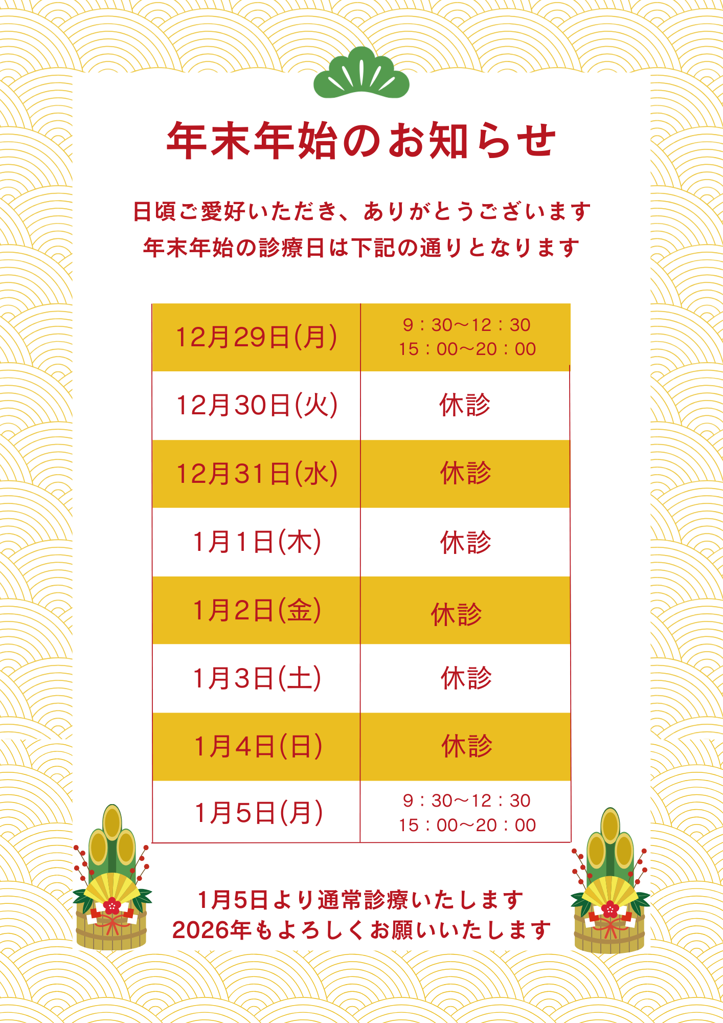 【五反野院】!要注意!年末年始は休診です。一年の計は元旦にあり!