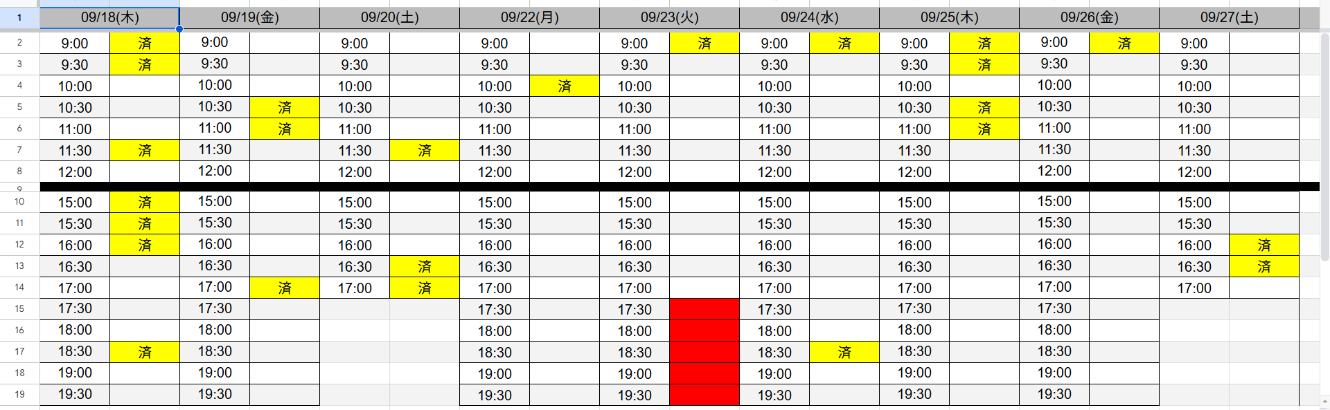 黄色のマスは予約が埋まったマス、赤のマスは祝日などで予約が取れないマスとなっております。