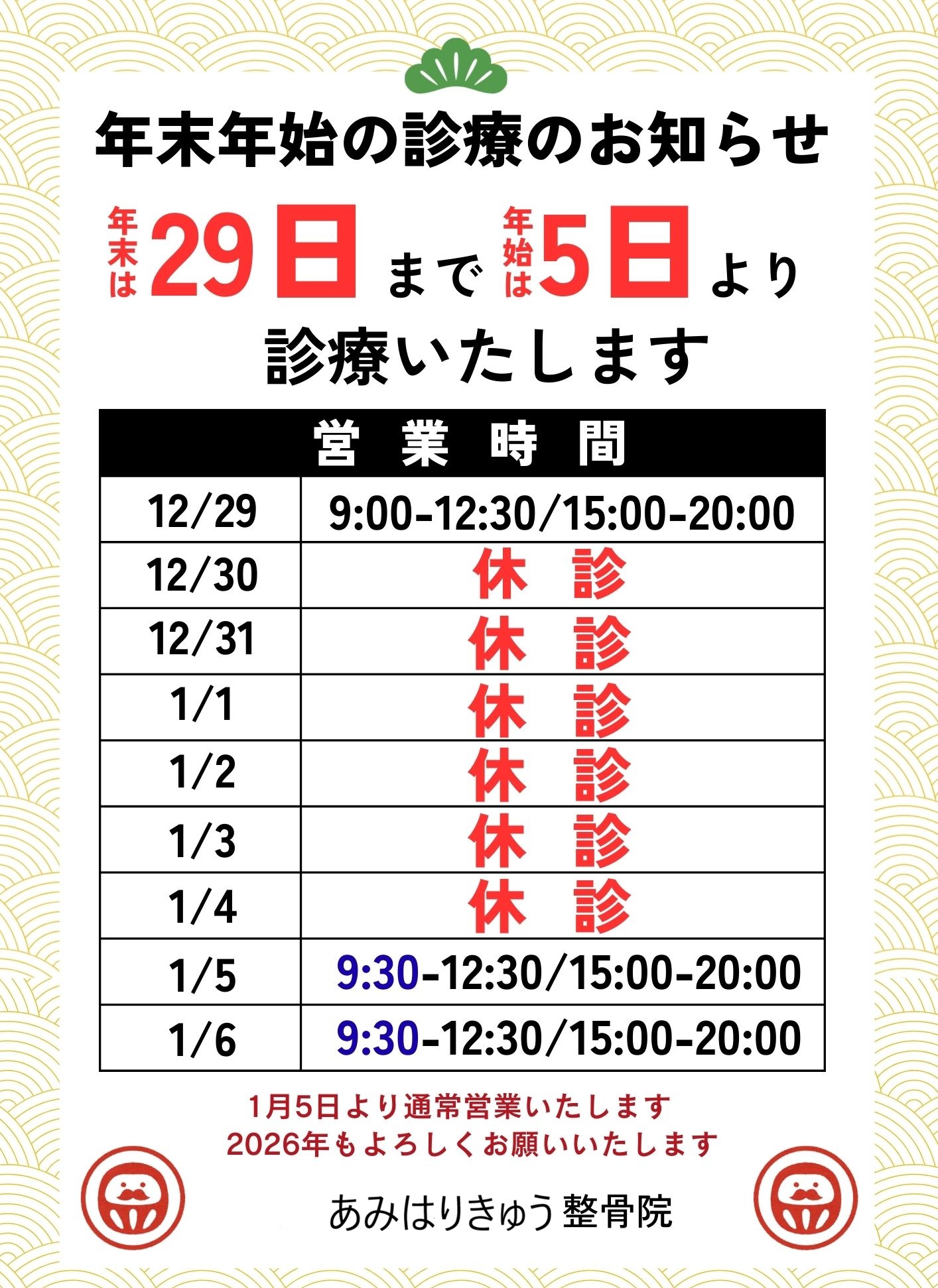 お正月明けの体の重だるさや、休み中に出た不調のケアもお気軽にご相談ください。