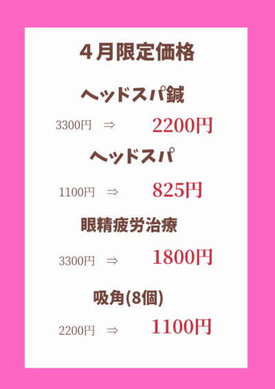 上記の自費施術が4月はお得に加療できます。